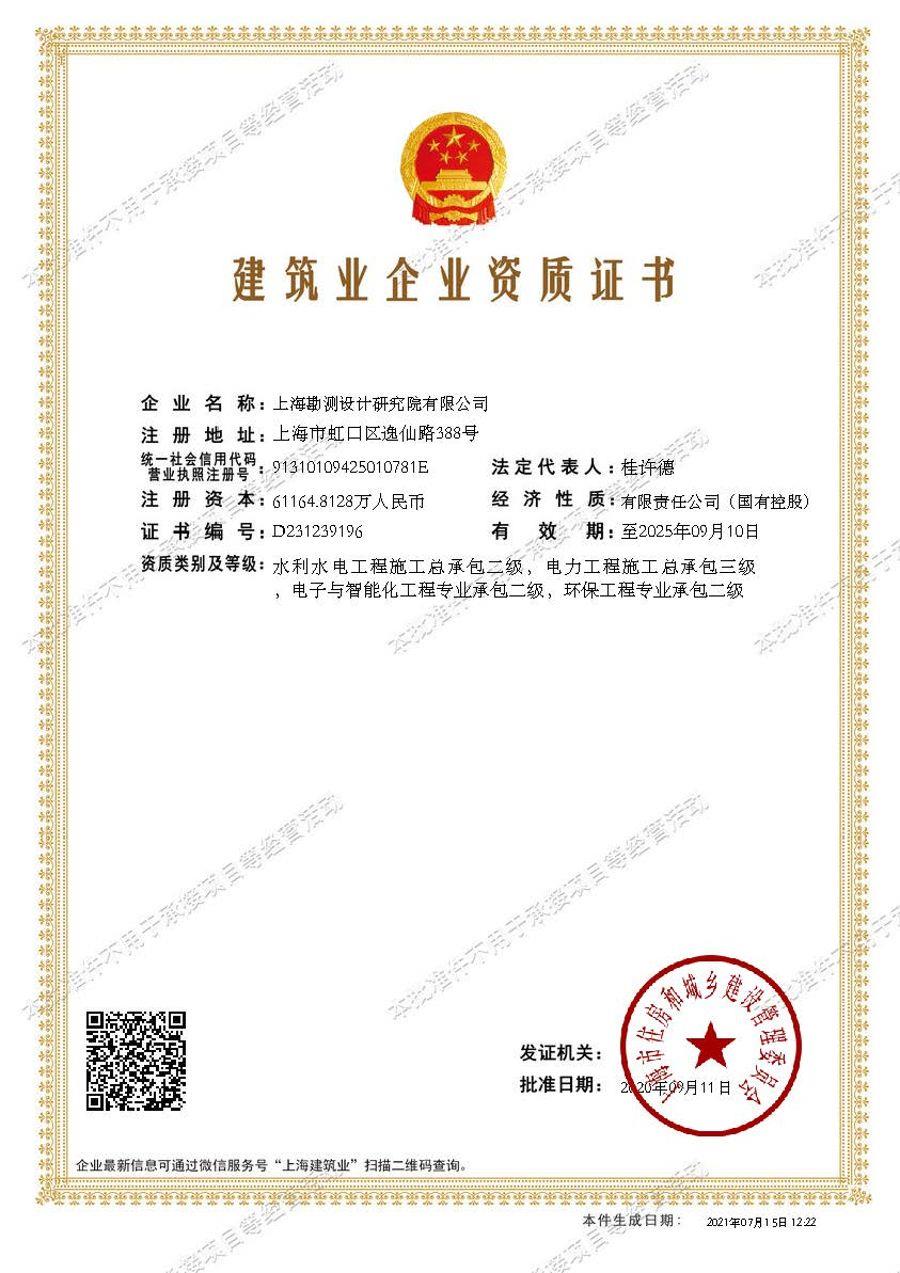 水利水電工程施工總承包二級(jí)資質(zhì),電力工程施工總承包三級(jí),電子與智能化工程專業(yè)承包二級(jí),環(huán)保工程專業(yè)承包二級(jí)